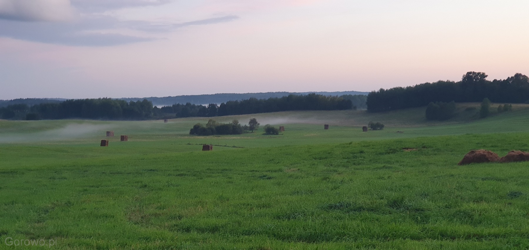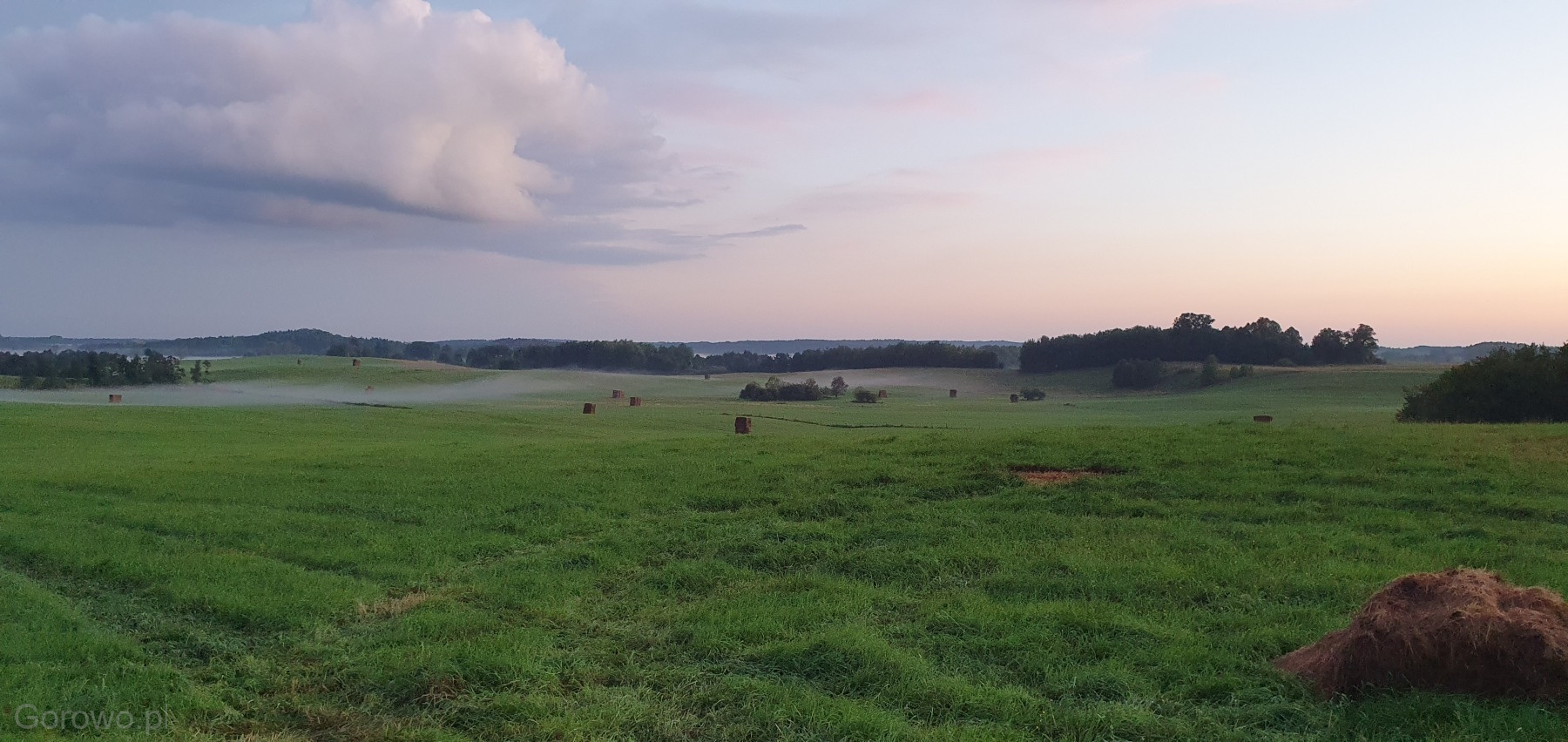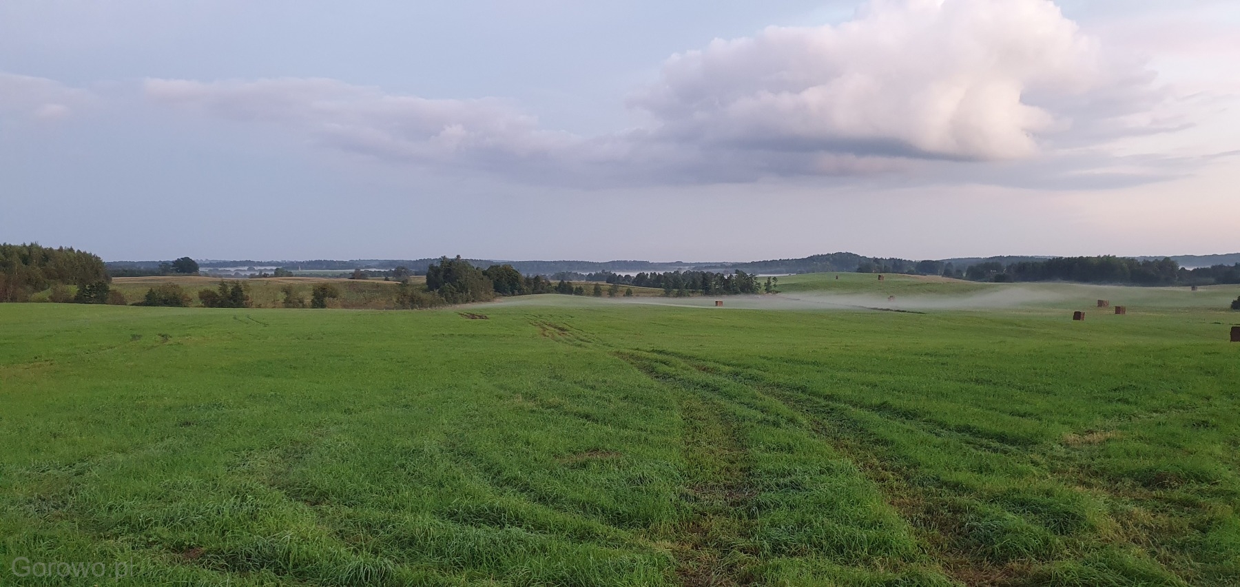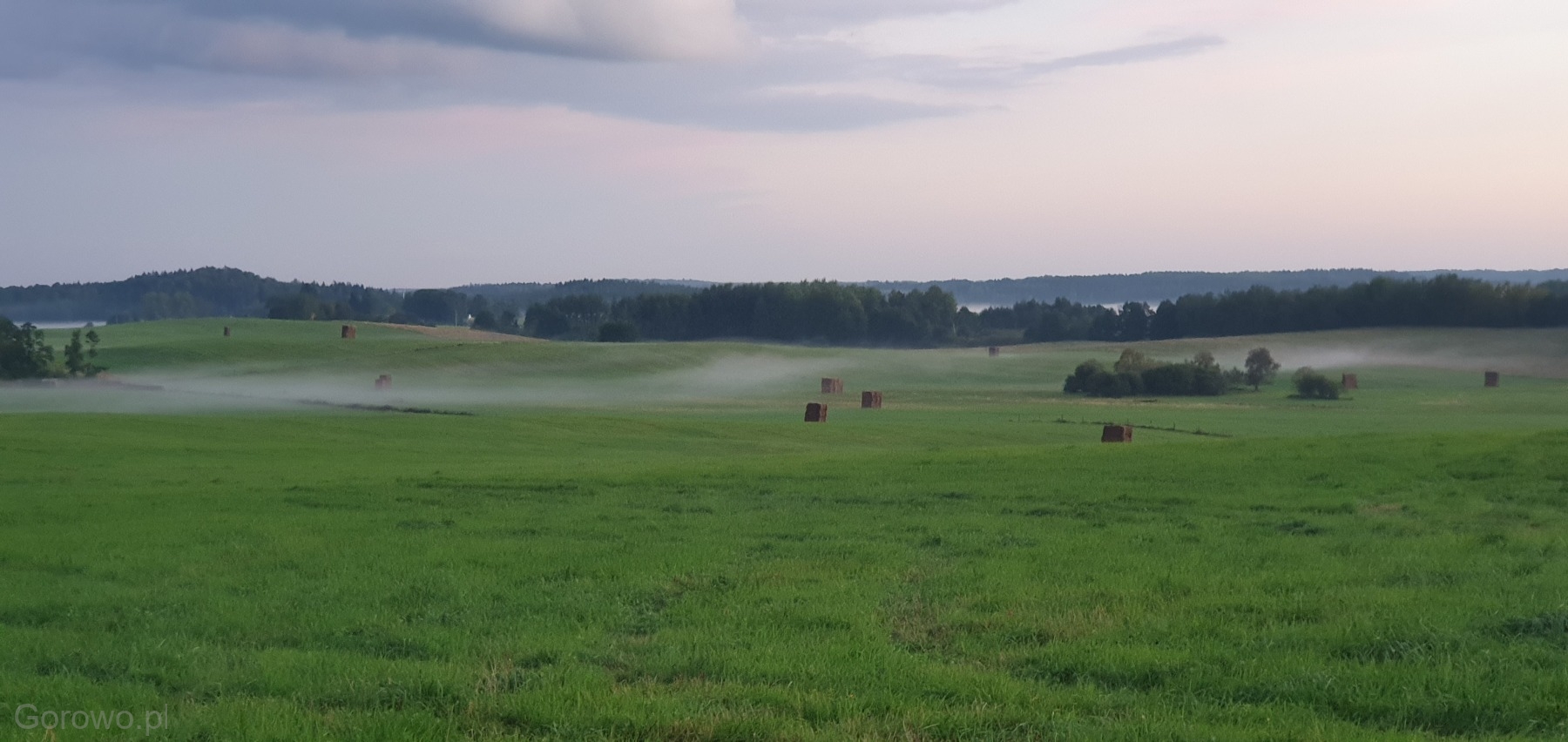 Rozległa, zielona przestrzeń otwiera się spokojnie ku horyzontowi. W oddali widać delikatne pasma mgły, jakby natura nakryła krajobraz cienką kołdrą, pozwalając mu jeszcze chwilę odpocząć. Na polach stoją równo ułożone bele siana – proste, codzienne świadectwo pracy rąk ludzkich i cyklu pór roku, który toczy się tu niewzruszony, zgodnie z rytmem przyrody.