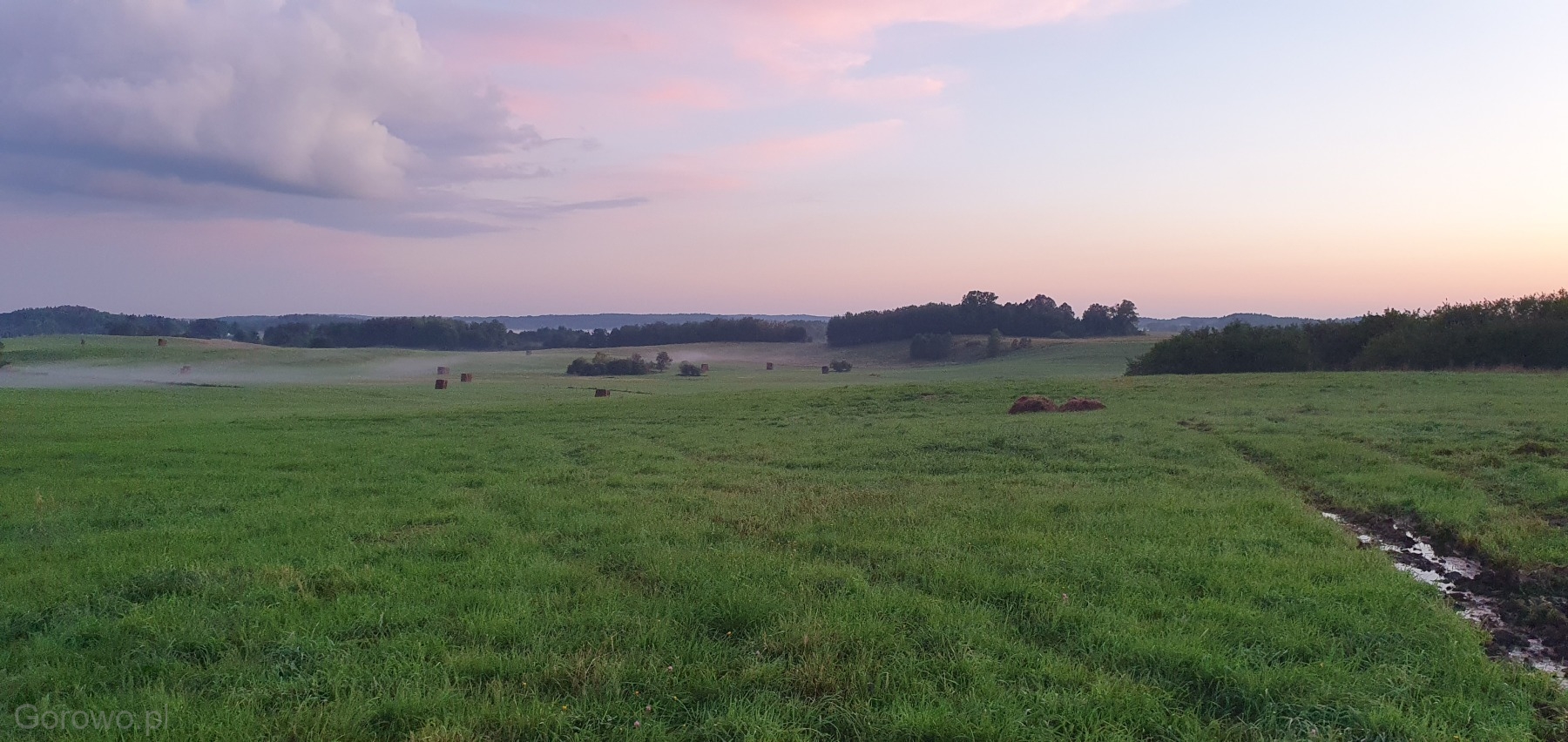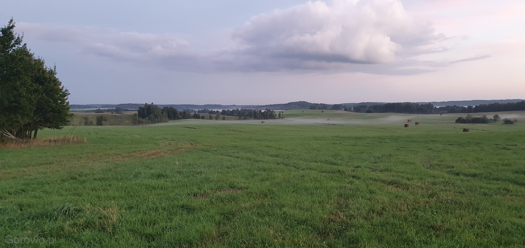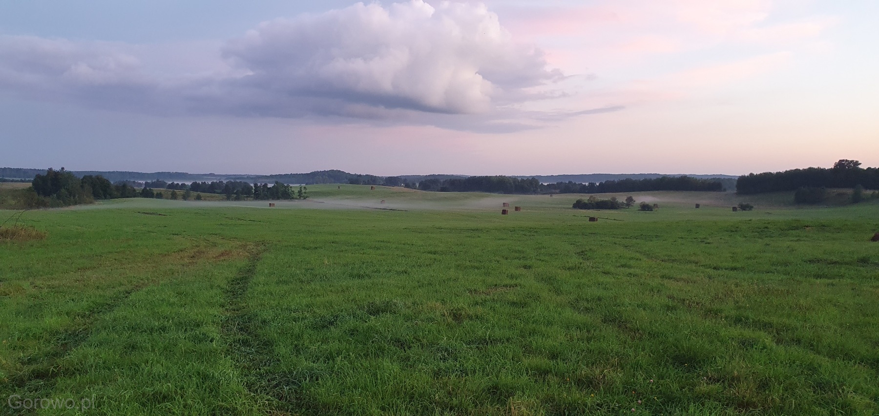 Rozległa, zielona przestrzeń otwiera się spokojnie ku horyzontowi. W oddali widać delikatne pasma mgły, jakby natura nakryła krajobraz cienką kołdrą, pozwalając mu jeszcze chwilę odpocząć. Na polach stoją równo ułożone bele siana – proste, codzienne świadectwo pracy rąk ludzkich i cyklu pór roku, który toczy się tu niewzruszony, zgodnie z rytmem przyrody.