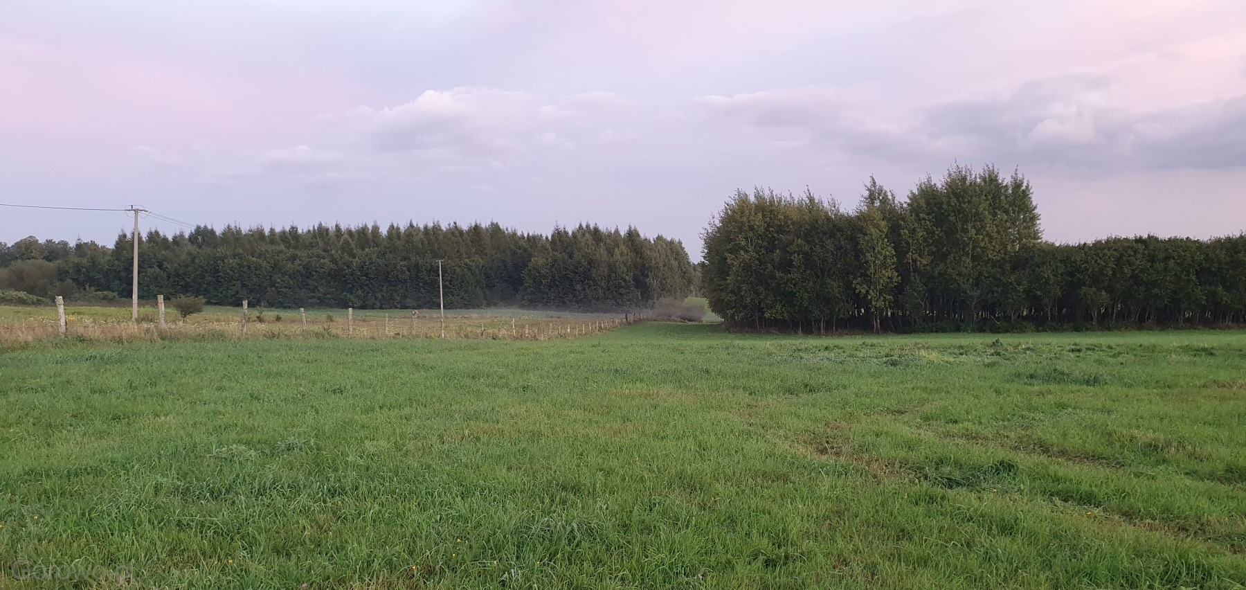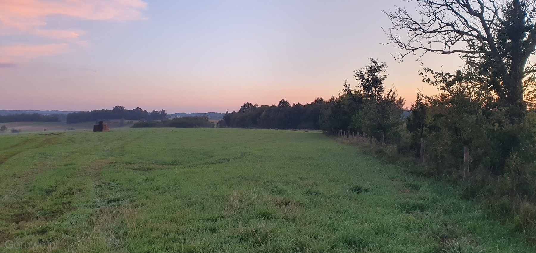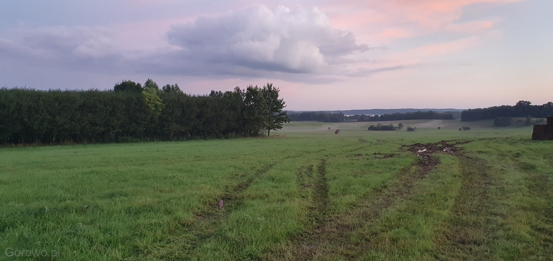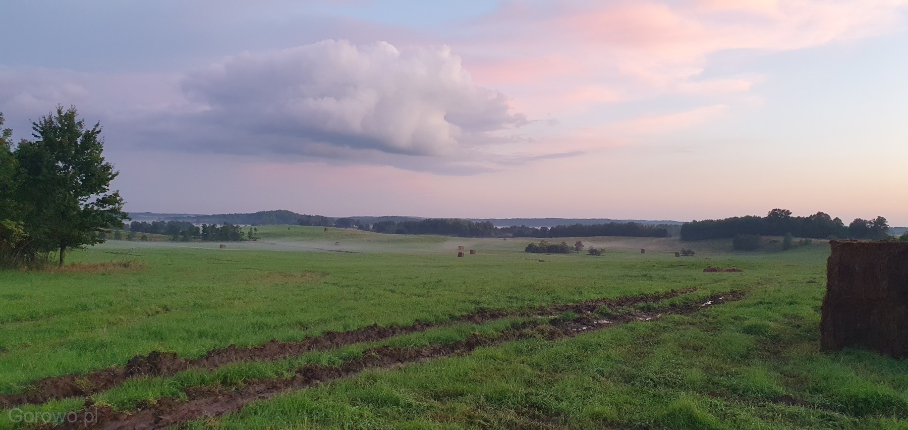 Rozległa, zielona przestrzeń otwiera się spokojnie ku horyzontowi. W oddali widać delikatne pasma mgły, jakby natura nakryła krajobraz cienką kołdrą, pozwalając mu jeszcze chwilę odpocząć. Na polach stoją równo ułożone bele siana – proste, codzienne świadectwo pracy rąk ludzkich i cyklu pór roku, który toczy się tu niewzruszony, zgodnie z rytmem przyrody.